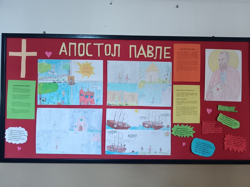 Ученици одељења 4/2, уз подршку вероучитеља Дарка Стевановића и учитељице Наде Танкосић, израдили су пано посвећен Светом Апостолу Павлу. Главни део овог пројекта био је тимски рад на стриповима, где су ученици кроз цртеже приказали четири значајне сцене из живота Апостола Павла: његово преобраћење на путу за Дамаск, бродолом на путу за Рим, проповед у Атини и чудесно спадање окова у затвору. Рад на стриповима био је подељен у тимове, што је ученицима омогућило да развијају сарадњу, креативност и осећај одговорности.