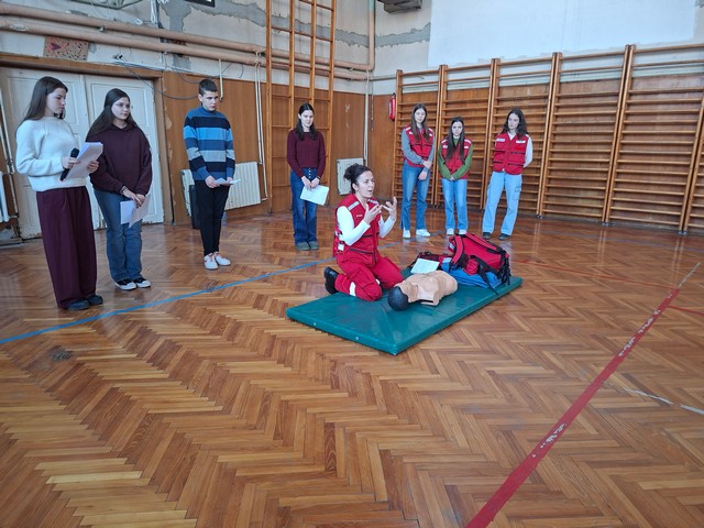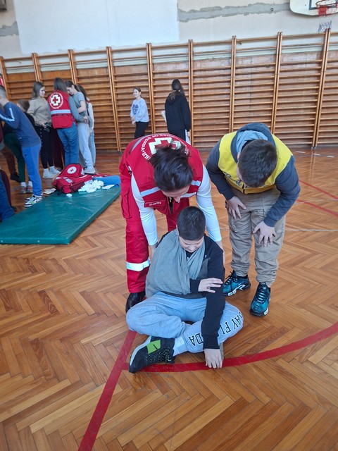 Сматрамо да треба да знамо како да пружимо прву помоћ ближњем у невољи. Весна Драмлић, председник Црвеног крста општине Лучани и предавач прве помоћи, подучила је ученике 6., 7. и 8. разреда како да се снађу ако се нађу у ситуацији да морају да помогну особи која је изгубила свест, крвари, има прелом, опекотине, епилептични напад или тровање. Ученици су имали прилику да вежбају једни на другима и разјасне евентуалне недоумице.
