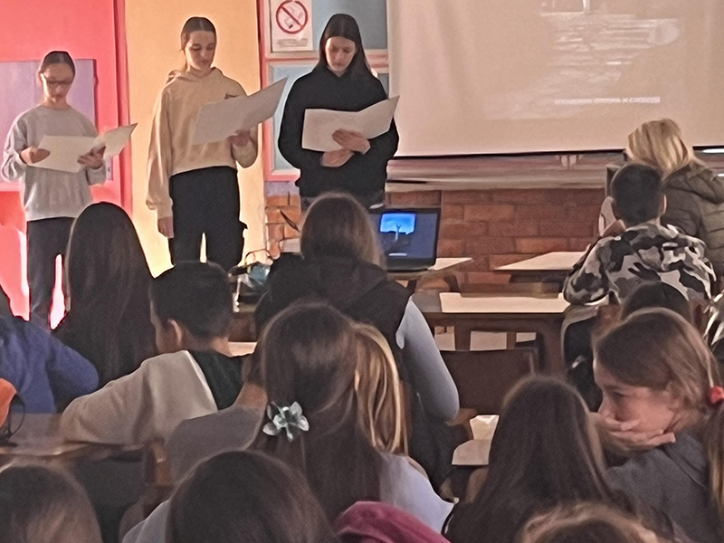 У оквиру тематског дана обележили смо Велики школски час, којем су присуствовали ученици са својим наставницима. Наставнице српског језика и књижевности, Марија Михајловић и Катарина Пеулић, наставник ликовне културе Петар Матовић и наставница информатике Љиљана Трмчић, заједно су реализовали наведену активност. После уводне речи наст. Катарине Пеулић, ученици су упознали присутне са историјским приликама које ду довеле до ове незаборављене трагедије. Ученици су казивали стихове “ Крваве бајке” Десанке Максимовић, као и казивање њених утисака о присећају на страдање невиних цивила у Крагујевцу, као и о настанку песме. Програм је пратила музика страдања у позадини, цртежи ученика на ову тему као и слике комплекса “Шумарице” на видео биму. Наш школски час одржан је у 12 часова у ђачкој трпезарији.
