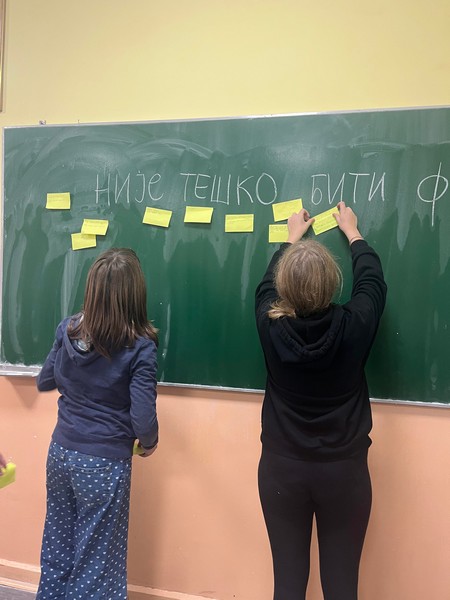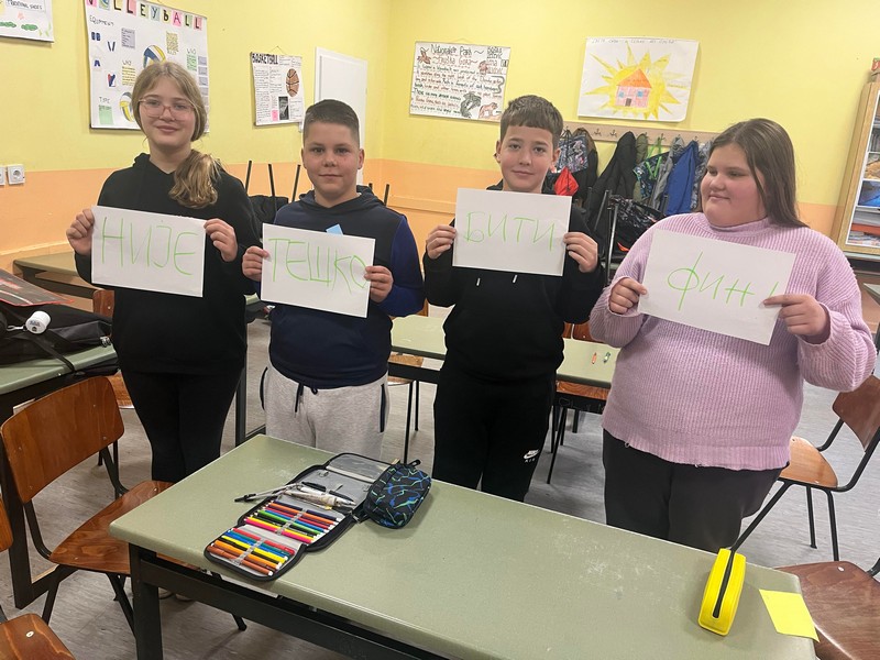 Данас је у учионици бр. 18. у одељењу 6-1 одржана радионица на тему “Није тешко бити фин”! Педагог школе је реализовао исту, по плану Појачаног васпитног рада са ученицима. Циљ радионице је управо да се ученици подстакну и оснаже да увек буду фини, добри! После интерактивне дискусије са ученицима, ученици су исписивали своје асоцијације на задату тему. Затим смо исте коментарисали и на четири велика папирима исписали сваку реч засебно. Следећа активност је била да се ученици поређају редом по слогану, а да остали ученици читају наглас. Потом ученици са исписаним папирима замене своја места како желе, а остали читају! Суштина је да којим год редом поређамо дате речи добијамо исто значење поруке.