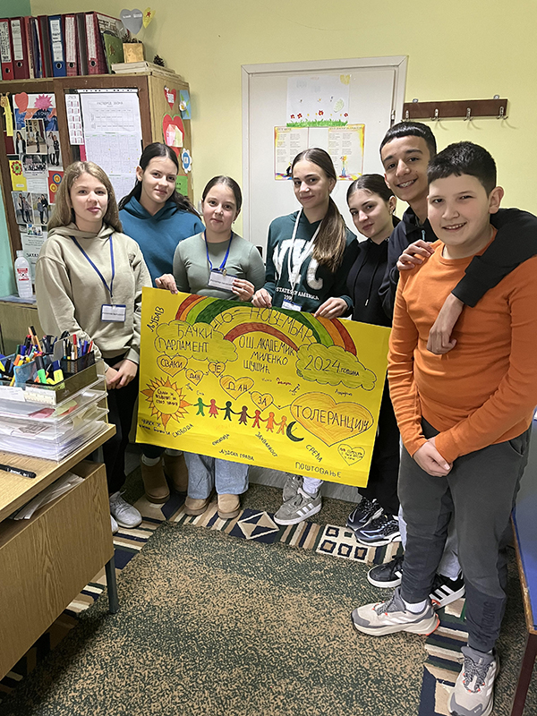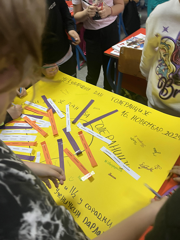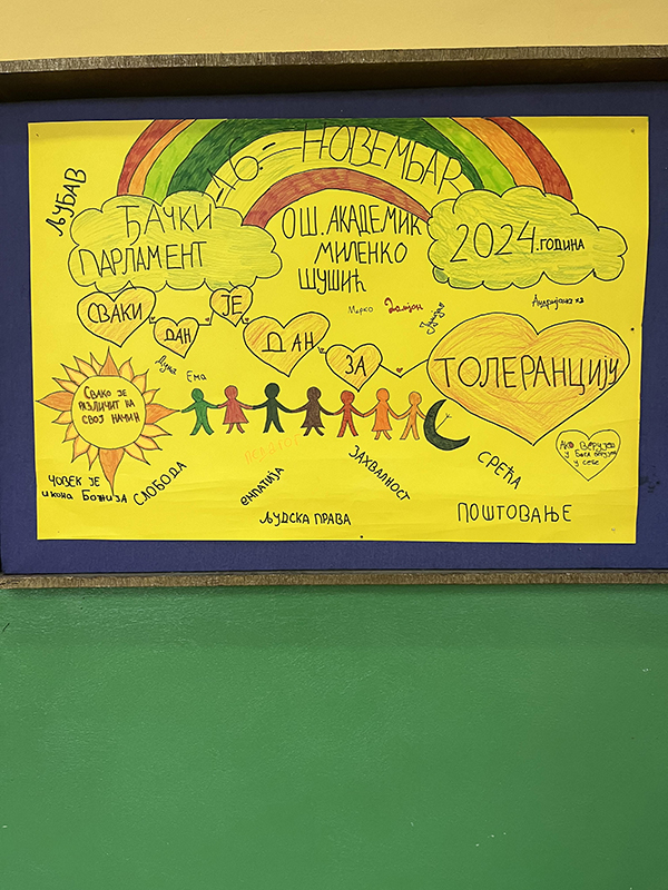 Ученички парламент предвођен педагогом школе данашње активности је обележио под слоганом”Сваки дан је дан за толеранцију”. Ученици су организовали дебату на ову тему, а продукте приказали на паноу. Такође су уз асистенцију педагога школе спровели радионицу са ученицима четвртог разреда на тему: “Толеранција, толеранција и само толеранција”. Са ученицима четвртог разреда разговарали су на тему толеранције, а дискусија се показала продуктивно. Сви ученици знају за толеранцију, а Ученички парламент је помогао и указао на то како се она може спроводити.