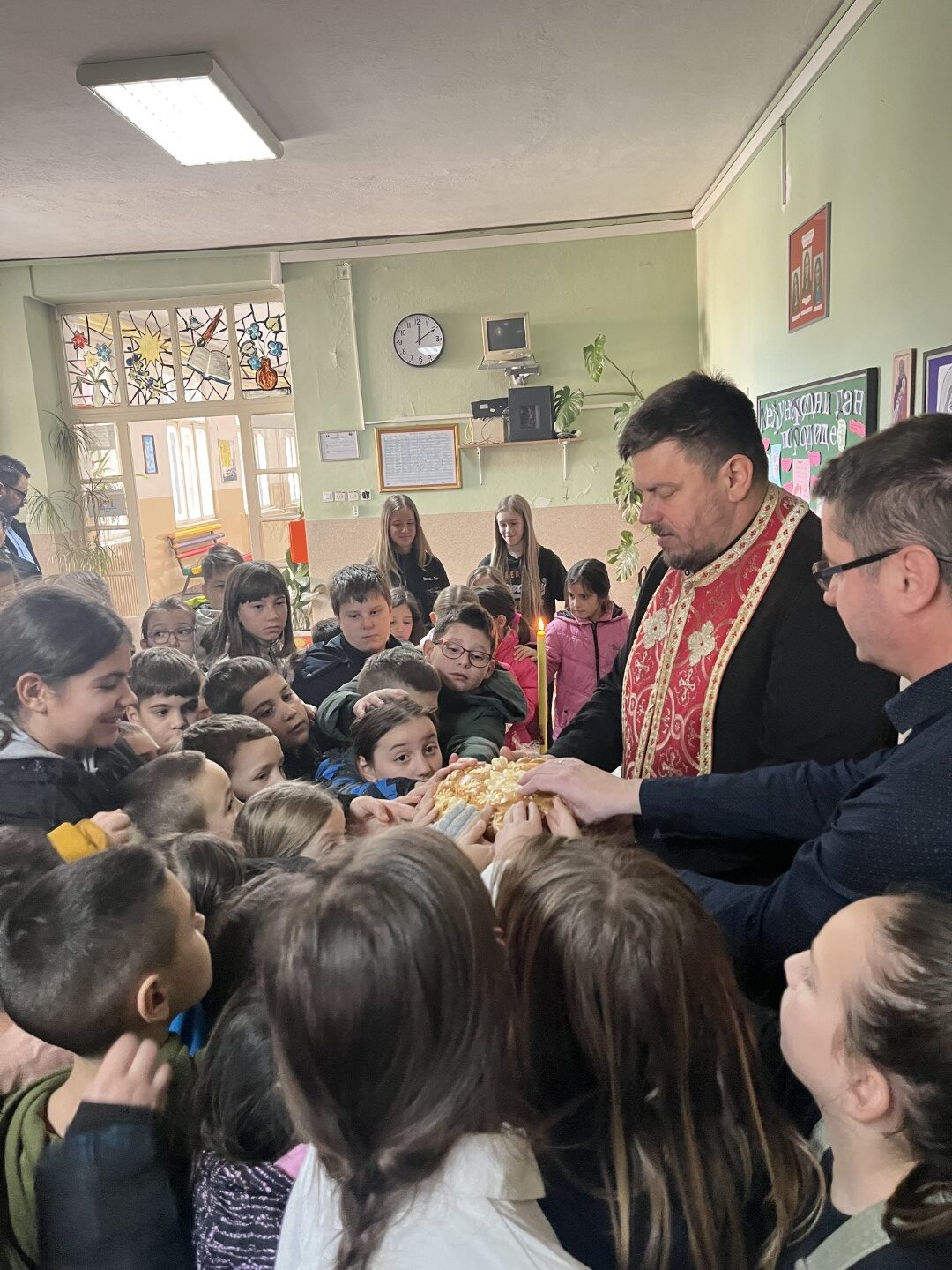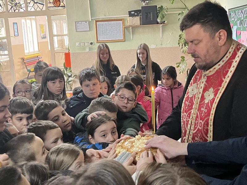 У главном холу школе у 12 часова, ученици са својим наставницима и осталим запосленима присуствовали су сечењу славског колача. Домаћин славе био је наставник математике, Далибор Бошковић.