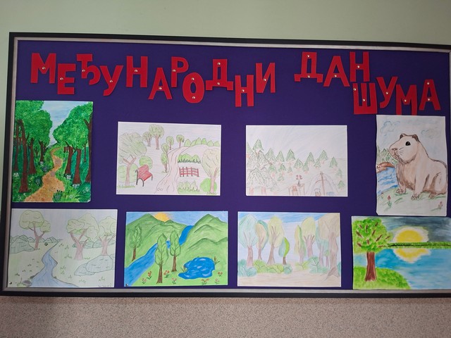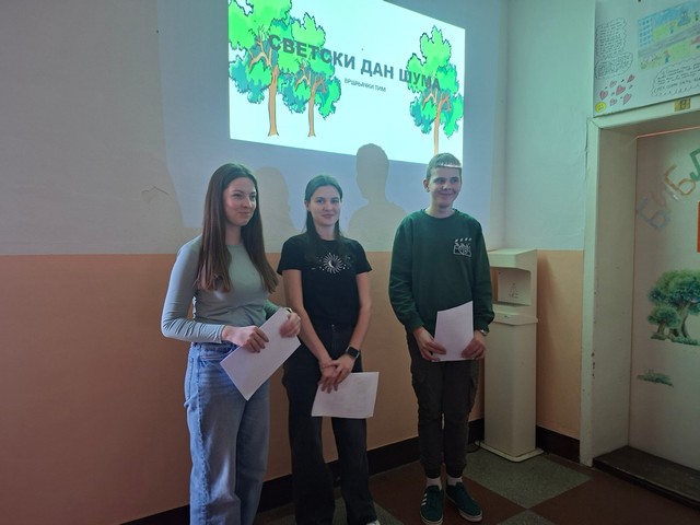 Данас је у нашој школи обележен Светски дан шума у организацији Вршњачког тима. Након јавног часа за ученике осмог разреда и остале заинтересоване ученике и наставнике, где је најпре одржана презентација о значају шума и старом дрвећу нашег краја, имали смо прилику да погледамо кратак филм Драгачевско благо о врстама дрвећа у Драгачеву. Час је завршен провером знања у виду квиза, а прво место је освојила Николина Гавриловић која је за своје знање награђена књигом. Овом приликом подељене су награде и члановима Вршњачког тима заслужним за осмишљавање и извођење различитих манифестација ове школске године: Петру Милованковићу, Дуњи Бабић и Вањи Бугарчић, као и гостујућем члану Елени Икодиновић, који су такође награђени књигама. Затим је у школском парку посађено дрво Црвенолисне шљиве, и на тај начин је ова генерација осмака оставила живи траг свог развојног пута у нашој школи.
